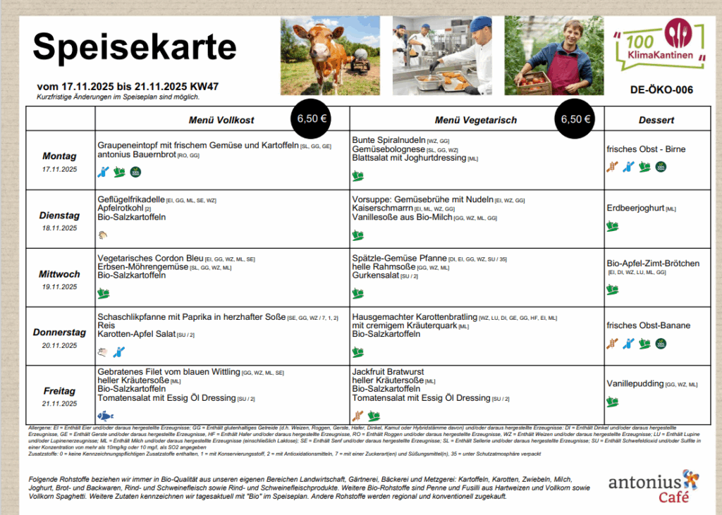 Unser Speiseplan (Mittagessen Montag bis Donnerstag) Welches Essen gibt es diese Woche? Die aktuellen Infos findest du hier: Speiseplan.pdf Unser Mittagessen bekommen wir von antonius. Jede Woche gibt es neuen neue Speisekarte.